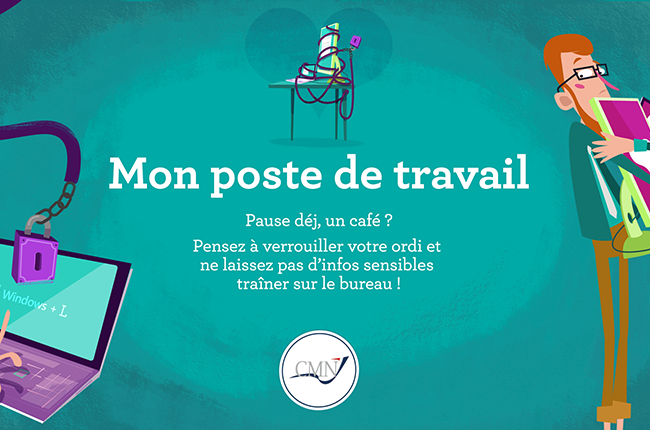 Solution • Adoptez le réflexe sécurité, verrouillez systématiquement votre ordi lorsque vous vous absentez. N’oubliez pas que Windows + L verrouille aussi directement votre machine. Et si vous tenez tant à votre ordi, montrez-lui que vous l’aimez ! Acceptez les mises à jours de sécurité, et ne changez rien à sa configuration en particulier son antivirus. Stockez vos données sensibles sur les serveurs de l’entreprise.